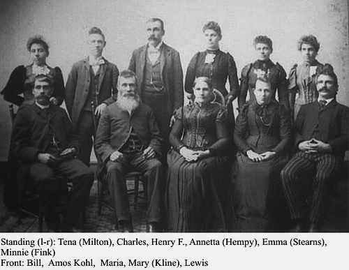 AMOS KOHL, farmer, Greenfield Twp., Sec. 26; P.O. Mechanicsville; born October 18, 1832, in Berks Co., Penn. In 1851, came to Wisconsin; in 1864, he came to his present owns 420 acres of land. Married Maria Grim in 1853; she was born in Center Co., Penn., in 1835; had eleven children, nine living—Mary, Henry, William, Annetta, Lewis, Emma, Tena, Charles and Mena. Source: History of Jones County, Iowa, Western Historical Company, Chicago, 1879, page 587. |