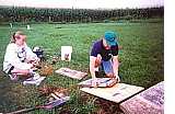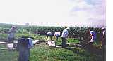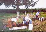 August 13 workday: LaVerta Langenberg from Mechanicsville, IA, using a probe to locate underground bases (She is the Jones County Genealogist who has provided many cemetery records.); Evelyn Stoll from Cascade, IA (bending over), daughter of Jones Commission Member Howard Andrews; Sara Stoll, FFA Member from Cascade and daughter of Evelyn Stoll; Margaret Tallman from Morley, IA holding the level; son of Evelyn Stoll; Steve Story from West Union and native of Olin in Jones County. (Steve and his wife, Donna, both retired educators, train and work well with volunteers.