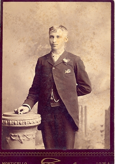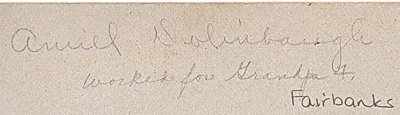 Mr. Dolinbaugh(?) who worked for Mr. Fairbanks, submitted by Julie Angus McKeen. I cannot make out the first name. Might be "Arvill" or "Amiel." The surname doesn't appear otherwise on the site, nor in the Jones County or Monticello newspaper indexes, nor as a surname using Family Search. Anyone have any information or ideas?