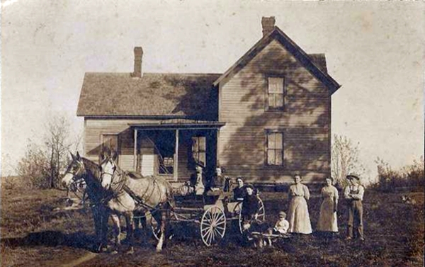 J. D.'s family, Brunen place, 1913. From left to right: Jim & Charlie (the horses!), Joseph Delancy (Papa), Mame, Leola, Harry, Joe, Nina Mae (Mama), Grace, and Lloyd. If you look closely, you can see that one of the family dogs is in harness for Joe.