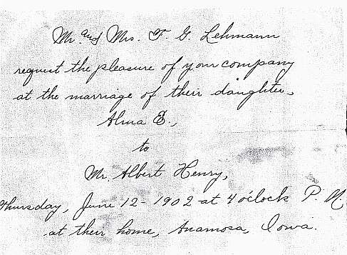 On Thursday, June 12, 1902, at 4 o'clock P.M., occured the happy wedding of the eldest daughter of Mr. and Mrs. F. G. Lehmann, Miss Alma E. to Albert Henry, at the home of the bride's parents. Rev W. E. Glanville officiating. Mrs. Glanville also being present. The bride and groom stood under a grand archway of roses with a lovely background of green and white ferns. The bride was attired in a beautiful pale fine silk dress. The groom wore a suit of black. The bride is one of the most charming young ladies of our city and is loved and respected by all. The groom is an honest and industrious young man and has worked for a number of years for Col. Shaw. After the ceremony was performed, their picture was taken by the bride's father and then all proceeded to the dining room where a decorated table with luxuries was awaiting them. | |||||