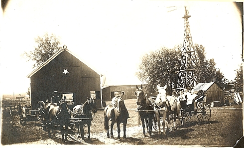 Catherine Renschler has sent a collection of Muller family photos, including this photo of the George Muller family. She says, "George (1870–1949) and his wife Christina are buried in Sacred Heart Cemetery. His farm was located in Section 23, Castle Grove Township. George's father, Nicholas Muller, had owned it previously and had operated a stable there. Nicholas bought sick or injured horses and nursed them back to health to resell them. I think the name was Star Farm or Star Stable. The back of this photo says 'George Muller west of Monticello at 3 Corners.' "