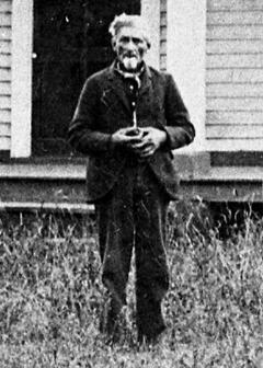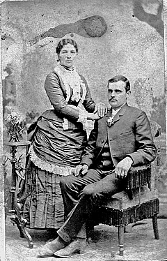 Nicholas Muller (1827–1913) and Katherine Even Kaiser Muller (1832–1912) in front of their farm house in Section 23, Castle Grove Township.