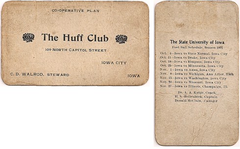 "I have attached two pictures of a 1902 Iowa football schedule. It is slightly bigger than a business card. One side has the 1902 Iowa football schedule on it. You can see the other. C. D. Walrod was originally from Barnum, IA.. He received his BA in 1895. He was superintendent for Onslow School District from 1899-1903. A professor from Iowa told me that the Huff Club was probably a boarding house close to the campus since there were no dorms at that time. C. D. Walrod graduated from law school in 1905. Any records or decedents in the area that maybe able to fill in the gaps?