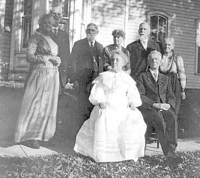 THE ALSPAUGH ANNIVERSARY PARTY IN 1916— Margaret Conmey Alspaugh was dressed in her wedding gown from 1866, sits with husband William, surrounded by family members.