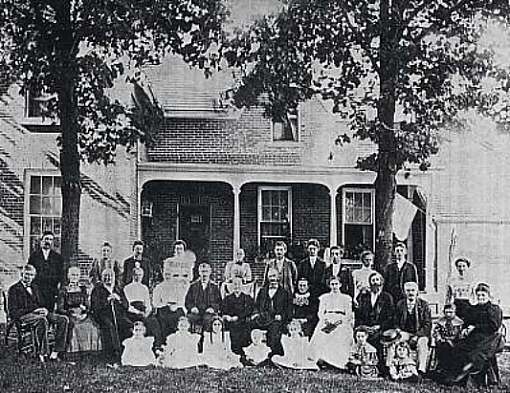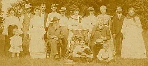Back row L to R: Unknown lady, unknown man, Edward J. Lightfoot, Orville Hosford, Cecil _______, unknown lady, Hazel Pink [Hosford] Bailey, Sarah [Lewis] Hosford [wife to Cecil sitting front of her], Palmer Alonzo Hosford & his wife Anna [Petersen] Hosford. |