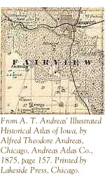 Among the residents of Fairview after 1840 were Edmund Booth and Dr. Sylvester G. Matson. In the vicinity, and extending eastward along the border of the timber, were John G. Joslin, Henry Booth, Benonia Brown, Dr. Clark Joslin, Eli and George H. Brown, and westward were Julius A. Peet, Marlin Peet, James. Silas and Neely Parsons, Gideon Peet (the father of the Peet family in the settlement) and Gideon N. Peet. Next to the last was Ambrose Parsons. Then came Alex. Rhoton and John Crow. John Crow and family came from Virginia. He was a courtly and dignified gentleman, and had the handsomest couple of mastiffs and horses in the settlement. The names given above are only of the heads of families of that time. |