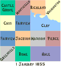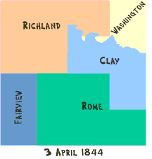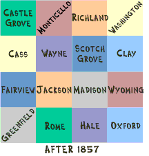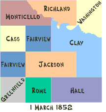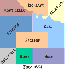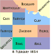 It will be observed that the last township was not formed until some sixteen years after the organization of the county, and that certain districts belonged at different periods, to quite a number of different towns. Wayne Township, for instance, had belonged to Richland, Monticello and Fairview previous to its organization as an independent town. Each township now corresponds to the Congressional numbering, rendering the political geography of the county as simple as a chessboard.