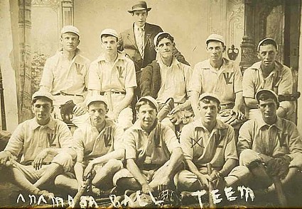 Donna Merrick and Carol Smith Terrell write that Carol's father, Clyde Benjamin Smith, is in the back row, 2nd from the right. Carol is his youngest daughter and says, "I know his brother, Clarence, was a good ball player, too, but I don't recognize him in that picture."