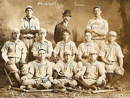 They may never have won a World Series (or a Spelling Bee, for that matter), but here is the Anamosa Baseball "Teem" from about 1910. Ellen Teschler has sent this photo. Her grandfather, James Leroy Armstrong, is second from the right in the first row. (The one with the X.) Can you identify any of the other team members? Click on the picture for a larger version.