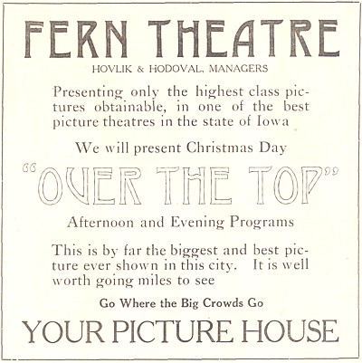 THE FERN THEATRE, whose display ad appears on this page, is located in the new Z. C. B. J. lodge building on Broadway, which was erected only two years ago. The theatre was built expressly for a moving picture theatre, being arranged fire-proof throughout, with a spacious stage, which allows of the production of some very high class plays, as well as the regular program of pictures, which are shown regularly during the year on Saturday and Sunday evenings.