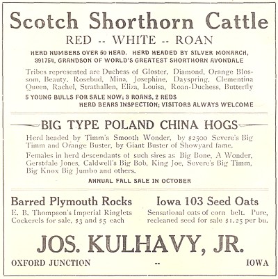 Many of the farmers should profit by Mr. Kulhavy’s experience in raising more oats to the acre, by using the Iowa 103 Seed Oats, the sensational oats of the corn belt, which he claims have yielded on his farm from 80 to 90 bushels per acre. Read the accompanying ad, in which you will find some stock and grain which is being offered for sale at the present time. Buy now. |
