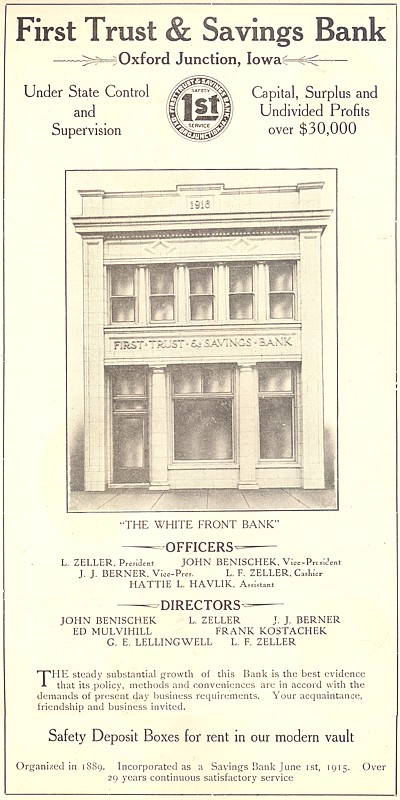 THE First Trust & Savings Bank, whose display ad appears on this page, has enjoyed twenty-nine years of continuous satisfactory service in this city, although not all these years under the name of Savings Bank. The Citizens Exchange Bank was organized by Mr. L. Zeller, on October 19th, 1889, with a capital of $10,000. The banking rooms were then located in the Tabor building on the south side of Broadway. The business soon increased to such an extent that it was found necessary to erect a new building, which was destroyed in the big fire of 1898. This necessitated the erection of another home for the bank. A $3,000 home for the business was built, the same now being used as the postoffice, with residence rooms on the second floor. Shortly after this the business was such that an assistant was found necessary and a new firm was organized consisting of L. Zeller as president, and L. F. Zeller, his son, as cashier, with a responsibility of over $100,000. The institution continued under this firm until June 1st, 1915, when it was again reorganized and incorporated as a Savings Bank, with the following officers and directors: L. Zeller, president; John Benischek and H. J. Ingwersen, vice-presidents; L. F. Zeller, Cashier; H. L. Havlik, Assistant Cashier; J. J. Berner, Joseph Milota and Edward Mulvihill. Later J. J. Berner was elected as one of the vice-presidents to take the place of H. J. Ingwersen, who removed from this city.