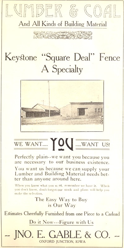 IN connection with the display ad appearing on this page for the Jno. E. Gable Lumber Co., we wish to say that never was a city the size of Oxford Junction so fortunate in having a lumber man so familiar with the business as the one who has the local management, O. A. Gable. The firm consists of Jno. E. Gable, of Cedar Rapids, and his son, O. A. Gable, of this city. The senior member can be mentioned only as a non-resident partner, although his advice along different lines is often very beneficial, as he is at the present time engaged in the lumber business at Cedar Rapids, on an extensive scale both wholesale and retail, which business he has successfully conducted for the past thirty-six years, being one of Cedar Rapids largest lumber dealers.