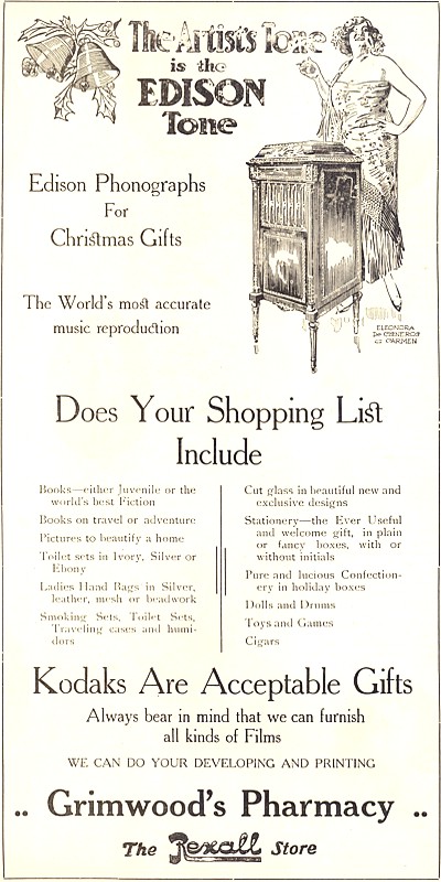 His holiday trade is exceptionally large, as the line of Christmas gifts that he has on display is of such a pleasing variety that many people in the community go to this store to make their gift selections. By a careful perusal of the accompanying ad you will be able to obtain a fair idea of opportunities for Christmas shopping. In this line as well as every other you are urged to make your selections early, as many articles are very hard to get this year and the early buyer has the choice.