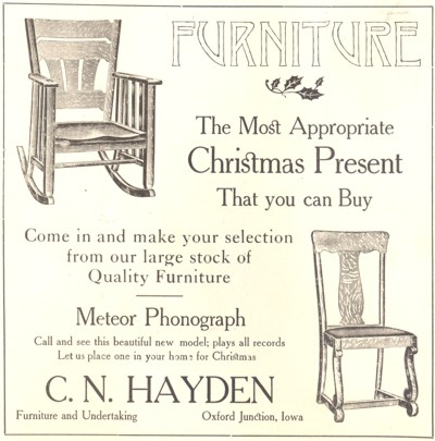 In presenting the accompanying ad, C. N Hayden, one of Oxford’s youngest merchants, having been in business in this city less than a year, makes an appeal to the people of this vicinity and community to purchase Christmas gifts this year that are useful and also carry with them durability. The proprietor is the son of Mr. and Mrs. L. E. Hayden, of this city. He was born at Olin, but with the parents moved to this city over twenty-six years ago where the family home has been since made. A number of years ago he purchased the café now owned and operated by Edw. Podolak, which he conducted very successfully for a time, and then disposed of it to the present owner and moved to Preston, where for a time was engaged in similar business.