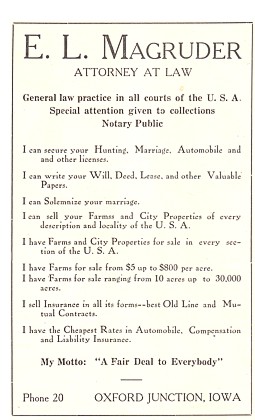 ATTY. Evard Lynn Magruder, whose ad appears in connection herewith, was born at the farm home of his parents in Jefferson County, West Virginia, where he remained until eighteen years of age. About this time his ambition was to secure a higher education than the rural schools afforded. The objections of the parents, who wanted him to remain on the farm, were of no avail, and he entered the Shepherd College, at Shepherdstown, W. Va. It was necessary for him to work his way through the college, but being determined to do this, the vacations found him employed at such positions as he could find. While at this college he was employed during the vacations as conductor and motorman for a street railway Co., in Washington, D. C. He graduated from the Academic Course in the spring of 1910, and in the fall entered the Valparaiso University, and graduated therefrom with the degree of Bachelor of Law in 1912. Lack of funds made it very hard for him to secure his education, but with an unfaltering determination he succeeded in accomplishing his purpose. It was then necessary to again find employment to secure money with which to set himself up in the law business. Much of this time was spent in this state, and in 1914 he returned to Indiana and was admitted to the Bar. He then went to Knox, Indiana, and formed a partnership with another lawyer, the firm name being Robbins & Magruder. In 1915 he decided to come to Iowa and therefore disposed of his practice in Indiana. In looking for a suitable location, he came to Oxford Junction, and shortly had his library and other office furniture moved here. He opened a law office in this city in July of that year, and since that time has enjoyed a good business in the law practice as well as the insurance and real estate business.