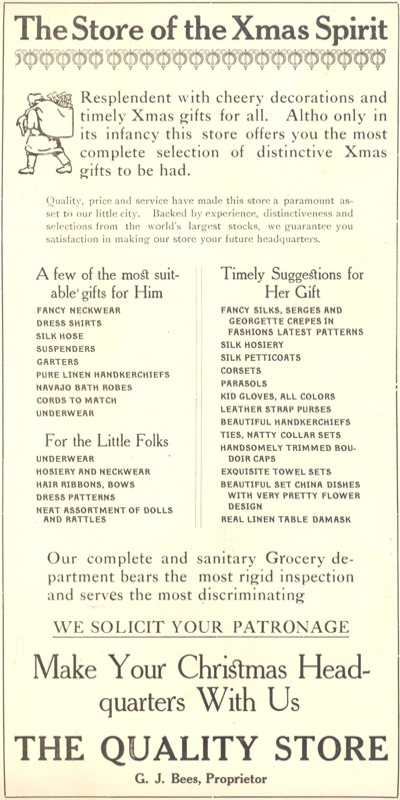 GABRIEL J. Bees, proprietor of the Quality Store, whose display ad appears on this page, has the distinction of being the only young man in this city who was compelled to leave his business entirely to respond to the call of his Government, in connection with which he was the only proprietor. When his call came to go into the service it was necessary for his wife to take complete charge of the business, which she did in a very creditable manner, and to her is due a great deal of credit in handling the problems that were confronting every merchant in all the smaller towns especially. She kept the business at its best until the return of the proprietor on November 26th.