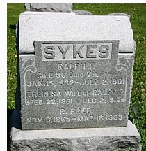 Ralph F. Sykes was born in Connecticut and enlisted in Co. E. of the 96th Ohio regiment in 1862. He and his family came to Oxford Mills in 1875. His obituary on July 11, 1900 states that he served his country faithfully and well for three years. It continues, "While in the army he experienced religion".