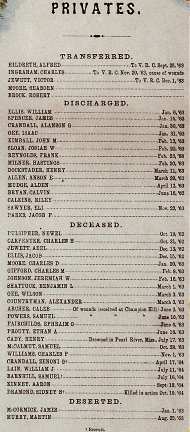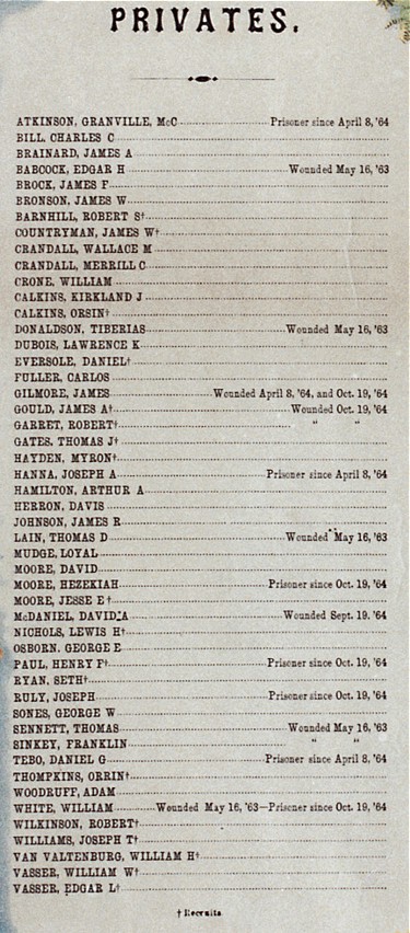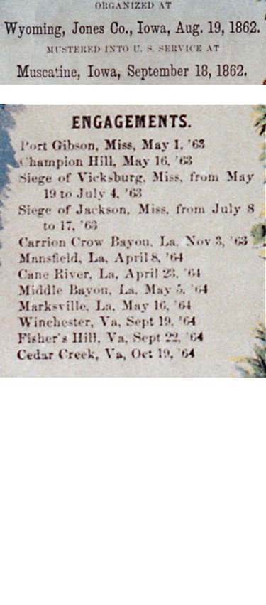 | An anonymous descendant of David Craig, pictured in the lower right corner, has donated this image of a commemorative lithograph of Company K, 24th Regiment, Iowa Infantry from the Civil War era. David lived the rest of his life in Palmyra, WI. Below the main image are enlargements of the important parts. |