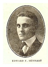 EDWARD F. BENHART, the son of Mr. and Mrs. F. T. Benhart, of this city, was born October 19th, 1896. His entire life with the exception of the past few years, has been spent in this city, where he attended the public schools, and from which he graduated with the class of 1913. During the last year, while attending school, he assisted with the work in the drug store of E. A. Grimwood, and it was here that he was imbued with the desire to take a medical course at the University. The next fall he went to Iowa City, and entered the State University as a medical student. He has remained in the college since that time with the exception of the summer vacations, which were spent at home. His age