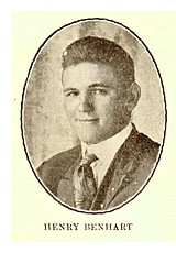 to Camp Dodge, where he was very much interested in the army work and was progressing nicely, when he was called upon to make the supreme sacrifice. Although he never reached the battlefields of France his sacrifice is none the less great, for he gave his all for his country. Henry, the son of Mr. and Mrs. Joe Benhart, Sr., was born at the farm home southwest of this city December 13th, 1896, and died at Camp Dodge, Thursday, October 10, 1918, at the age of twenty-one years. The remains were escorted to this city by one of his company companions and funeral services were conducted Tuesday forenoon, October 15th, by the Masonic Lodge, of which he was a member. The body was then taken to the Mayflower cemetery, where short services were held and a firing squad of the Home Guard company fired a farewell salute and taps was played for the departed hero. His untimely death was a shock to the entire community, where he had spent his life and had gathered around him a large number of friends. The mother although grief-stricken by the death of her boy, can well be proud for he made the supreme sacrifice, and his name, which is represented on our service flag by a golden star, will live through ages.