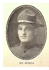 ED BURDA, the son of Mr. and Mrs. Frank Burda, of this city, answered the draft summons of September 19th, 1917, and reported at Anamosa, from which place he was immediately sent to Camp Dodge to begin his training as one of Uncle Sam’s fighting men. The Sunday before Thanksgiving of that year he was granted a furlough and visited here with his parents. Upon his return to camp orders were received for the transferring of his company to Camp Pike, Ark. While at this camp he was confined to the hospital for four months, the trouble from which he was suffering requiring a very delicate operation. When able to be about again he was sent to Camp Merritt, N. J., August 15th, of this