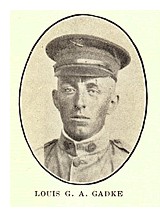 LOUIS G. A. GADKE, the oldest son of Mr. and Mrs. Fred Gadke, of this city, was born in Cedar County, Hale Township, July10th, 1897. The family moved to Winnipeg, Canada, where the home was made for four years, and then returned to this community, and three years ago moved to this city. He has spent most of the time during these three years at this place, although at the time he entered the service of his country was employed at Omaha, Nebraska, where he enlisted October 29th, 1917. He was then transferred to the Government school at Ft. Monroe, Va., where he took up the branch of the service as motorman which required considerable study. He was later sent to Fort Travis,