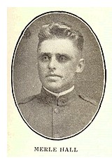MERLE HALL, the son of W. D. Hall, living south of this city, was born February 21st, 1896. His life, with the exception of the last couple of years, has been spent entirely in this community. He attended the public schools in this city from which he graduated in the year 1913. He assisted his father with the work on the farm until the year after graduating from the local school, when he entered the University at Iowa City, where he expected to return, but was called in the draft of September 21st, 1917, which ended his school work for the time being. He departed from Anamosa for Camp Dodge, where he remained until the 28th of March, when he was sent to Camp Custer, Mich. During his service at Camp
