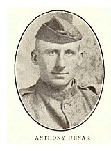 ANTHONY HENAK, the son of Mr. and Mrs. James Henak, was born on the farm south of this city August 18th, 1891, where he has continuously made their home assisting with the work on the farm until called into the service of his country. He was one of the nineteen boys called in the draft on July 25th, and who, previous to their reporting at Anamosa, were honored by a big public meeting in this city, at which time Hon. Robt. Cousins addressed the large gathering that had gotten together to bid the boys farewell. They reported to the local board at Anamosa and were ordered to Camp Gordon, Atlanta, Georgia. The demand for men in France was so great that they were only given six