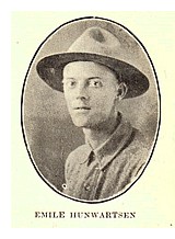 EMILE HUNWARTSEN, about two years ago went to Marion, So. Dak. where he was employed, the summer months being engaged with a base ball team at that place. At the time of the first registration he was still at that place, therefore his name was enrolled there. Just before being called into the service he came home for a visit with his parents, and it was while here that he tried to get a release from his local board that he might enlist. This release was not granted and he received his call very