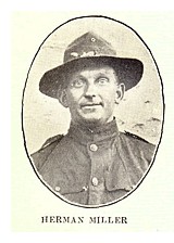 HERMAN MILLER, the son of Mr. and Mrs. J. F. Miller, of this city, made the supreme sacrifice for his country, giving up his life at Camp Custer, Mich., where he was stationed with his company receiving the training necessary before being sent to the far away fields of battle, the cause of his death being a severe attack of pneumonia, which followed a siege of Spanish Influenza. Herman was born June 17th, 1891, at the farm home three miles southeast of this city, and died October 10th, 1918, at Camp Custer, Mich., at the age of twenty-seven years. A message was received in this city stating that he was seriously ill a few days previous to his death, and his brother, John, hurried to his bedside and was