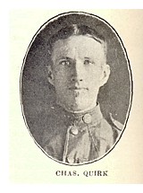 CHAS. QUIRK, the son of Mr. and Mrs. John Quirk, living just north of this city, was born December 29th, 1889, and will have reached his twenty-ninth birthday this month. His life has been spent in this community and he was one of the young men having registered in this city June 5th, 1917. He was very anxious to get into some branch of the service, but owning to the fact that there was a great deal of work on the farm he waited for his draft call, which occurred July 29th, at which time he reported at Anamosa, one of the two boys from this township included in the draft of that date. Upon reporting at Anamosa they were ordered to Camp Forrest, Georgia, and was chosen from the contingent