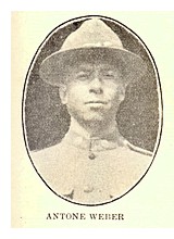 ANTONE WEBER, the eldest son of Mr. and Mrs. N. J. Weber, who live just west of this city, was employed at Chicago at the time of the first registration, and although he registered he did not wait for his draft call, but enlisted December 20th, 1917, and was sent to Camp Logan, Texas, where he received the most of his training. He was later transferred to Camp Merritt, but only remained there about a week and sailed overseas the 10th of May, 1918. The parents received a card from the headquarters at Washington announcing his safe arrival and then it was some time before they had any news from him. Later in a letter to them he explained that he had been on the move so much of the time that it was almost impossible to write letters, and out of