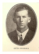 [NOTE: Coporal Otto Wosoba was seriously wounded while in action on November 10, 1918, and died the following day, November 11, an hour before the Armistice was signed. He was buried in France, but in 1921 his body was exhumed and moved to Mayflower Cemetery where he is buried with his mother. His obituaries give his birthdate as October 30, 1893. His gravestone says October 30, 1892. Richard Harrison]