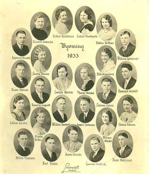 A photo of the 1933 Graduating Class of Wyoming High School, Wyoming, IA, sent in by Sharon Brodersen Lindbloom of Fort Wayne, IN. She says, "My father, William Brodersen, graduated in this class along with his cousins Esther Brodersen and Elizabeth Fishwild.