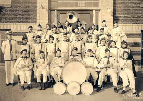 The Wyoming High School band played at the Chicago World's Fair on October 28, 7:00-8:00 p.m., in front of the Court of States and on October 29, 3:00-4:00 p.m. in front of the Hall of Science. Members of the Wyoming Band are as follows, left to right: First Row: Verna Hanold, Dick Smith, Bill Alden, Madge Milsap, Bill Reade, Melvin Thomsen, Maxine Cook. Second Row: Director, Roy T. Schwab, Janice Roussh, Crystal Stoffel, Carmen Bahsen, Melvin Sievers, Clair Felken, Richard Rohwedder, Jean Brodersen, Betty Levsen, Martha Dick. Third Row: Clifford DeMoss, Robert Hansen, Irwin Sievers, Orval Dawes, Floriene Herzberger, Lee Mallisoat, Jean Layton, Gayle Hanold. Fourth Row: Harry Rohwedded, Helen Levsen, Robert Layton, Robert Pelkey, Harry Conmey, Eleanor Close, John Heasty, Dean Mallicoat. |
