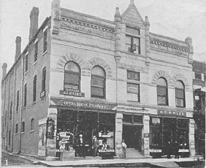 The two stores on the main floor were occupied by C. R. Howard's Opera House Pharmacy and H. E. M. Niles who sold notions and ladies furnishings. This space was later taken over by E. S. Stone's Jewelry.